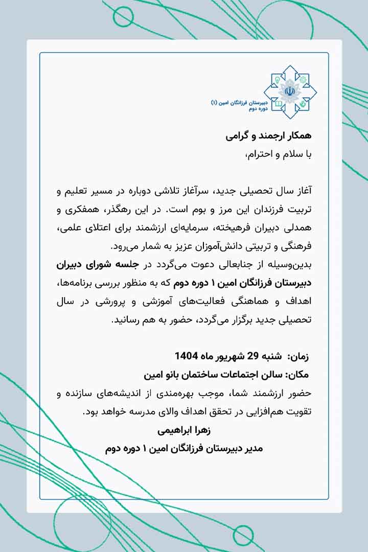 اطلاعیه ۲: اولین جلسه شورای دبیران سال تحصیلی ۰۵-۱۴۰۴